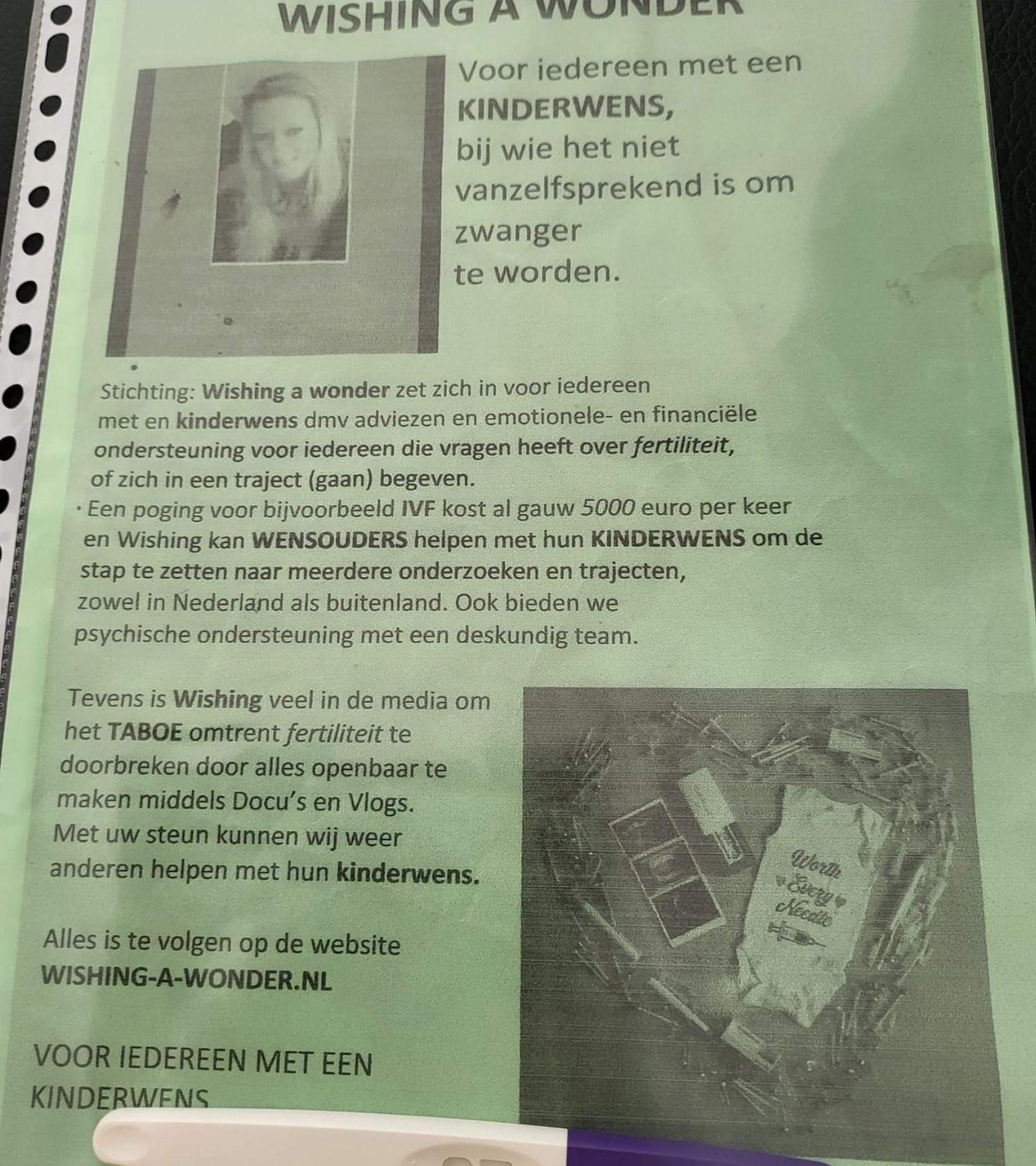 De stichting Wishing a wonder heb ik 9 februari 2017 opgericht om anderen te kunnen adviseren en helpen met hun kinderwens en er daardoor sneller hun wens laten uitkomen, door de juiste wegen te bewandelen en niet van het KASTJE NAAR DE MUUR EFFECT hoeven door te maken. Tevens heb ik alles gevlogd wat ik tot nu toe heb meegemaakt omdat ik vind dat het uit de taboe moet. Alles mag in beeld. Zowel onderzoeken, puncties, blijdschap, verlies. Alles is te zien in de vlogs en documentaires. Wishing a wonder heeft al meer dan 30 wensouders effectief geholpen en begeleid.